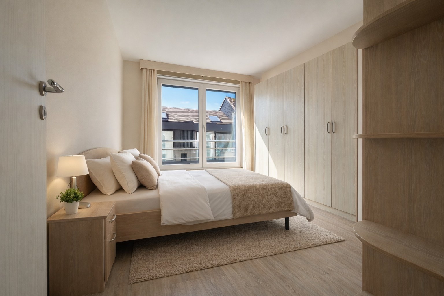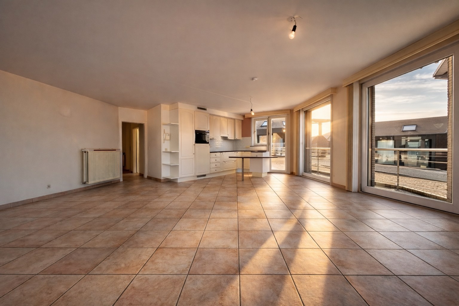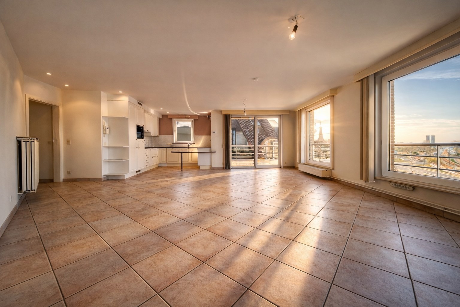 Indeling van het appartement: Inkom met ingemaakte vestiairekasten, een zonovergoten woonkamer met knappe zichten, een open en volledig ingerichte keuken, achteraan twee volwaardige slaapkamers en een ingerichte badkamer met ligbad.