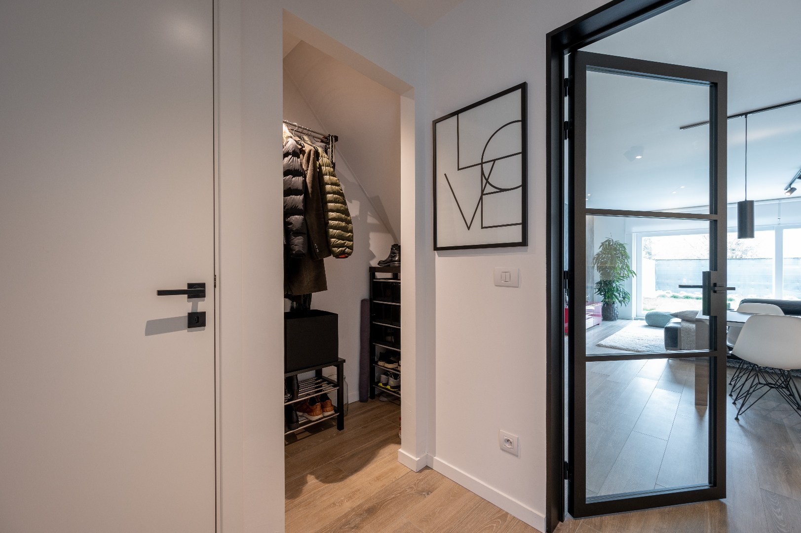 Indeling: Inkom met gastentoilet en vestiaire, een ruime en brede woonkamer met zicht op de tuin en het terras. De leefruimte is voorzien van een keramisch parketvloer en vloerverwarming. De keuken is luxueus ingericht met een “Smeg”-gasfornuis, ingebouwde vaatwasser, ijskast en dampkap. Verder een praktische bergruimte/wasplaats en een grote fietsenberging. Op de eerste verdieping twee extra ruime slaapkamers en een badkamer met inloopdouche, toilet en lavabomeubel. Er is een vaste trap naar de zolderverdieping die gebruikt kan worden als derde slaapkamer of hobbykamer. Er is een parkeerplaats voorzien voor de woning.