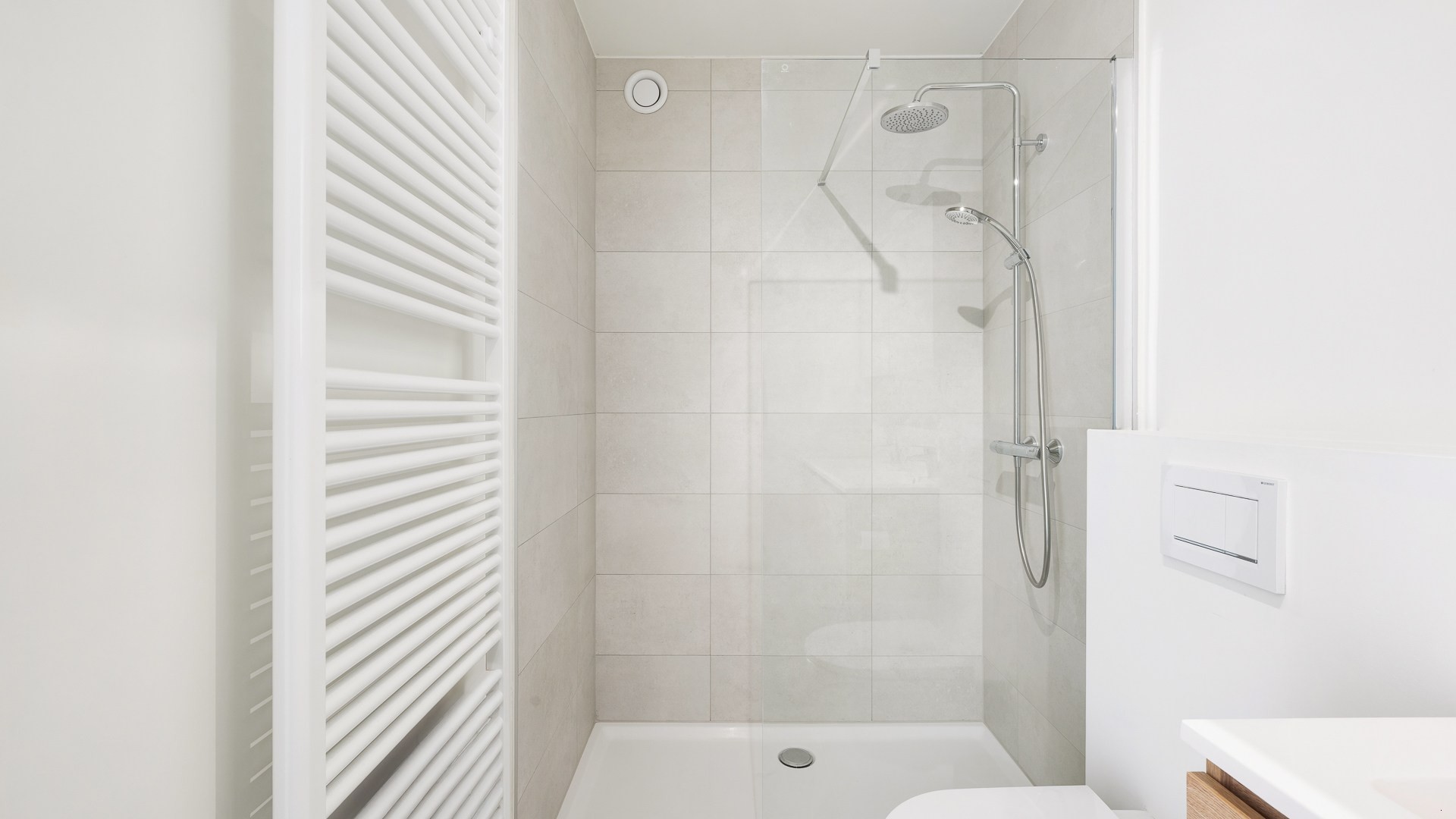 Indeling: Inkom, een aangenaam ruime leefruimte met een compleet ingerichte open keuken voorzien van alle hedendaagse toestellen, vanuit de woonkamer toegang tot het terras vooraan, achteraan twee volwaardige slaapkamers. Verder beschikt het appartement over twee modern afgewerkte badkamers met douche, waarvan één voorzien is van een lavabomeubel en de andere van een toilet. Zowel aan de voor- als achterzijde is er een terras aanwezig.