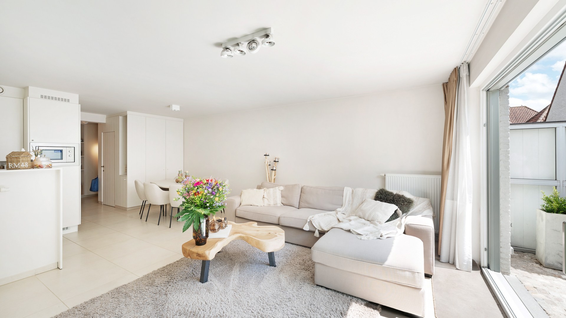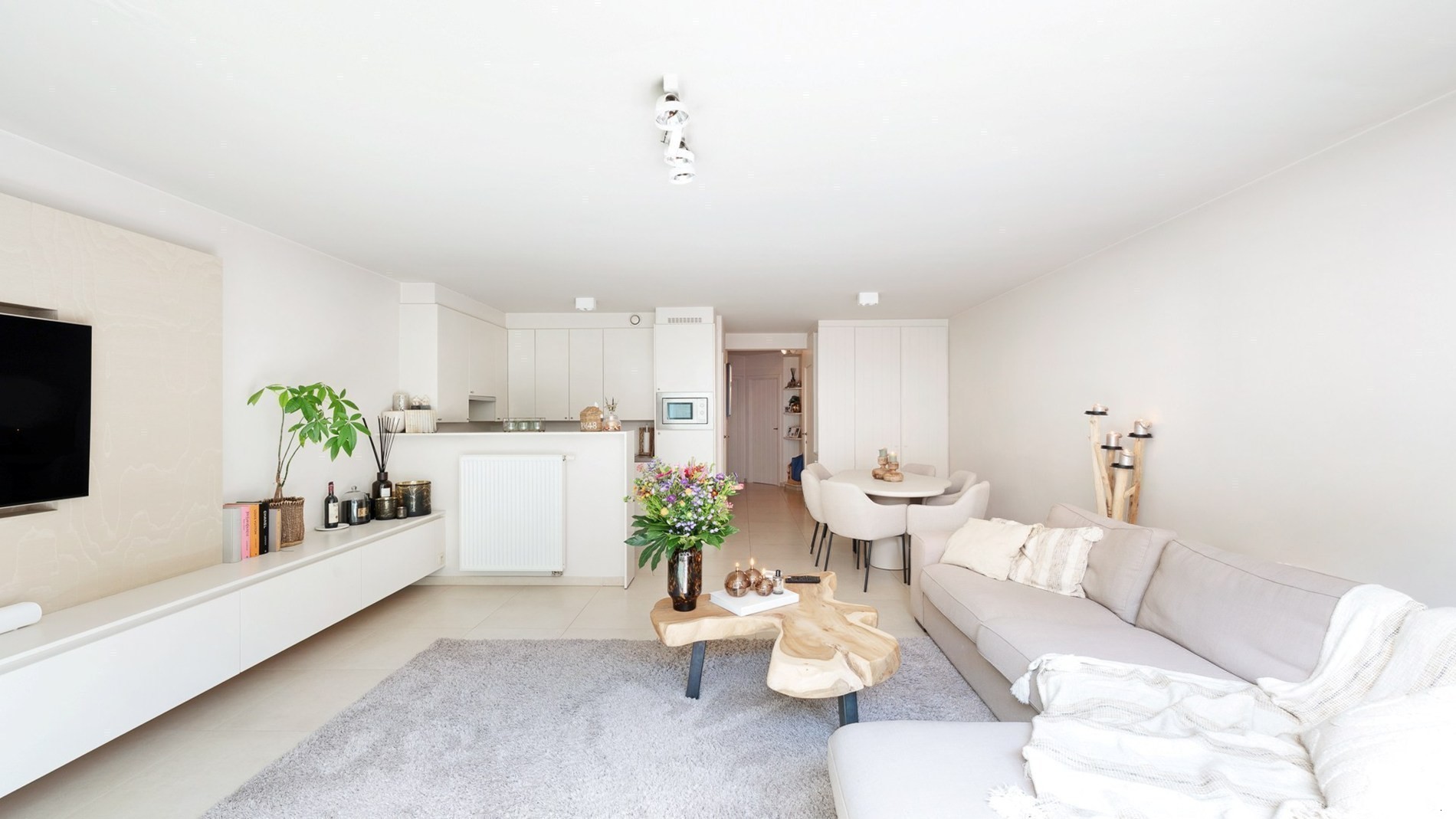 Via de inkomhal met gastentoilet en vestiaire komt u in de zonnige leefruimte. Hier geniet u van een gezellige woonkamer met televisiehoek en rechtstreekse toegang tot het zuidgericht terras – een absolute troef. Aansluitend bevindt zich de volledig ingerichte leefkeuken met eethoek.