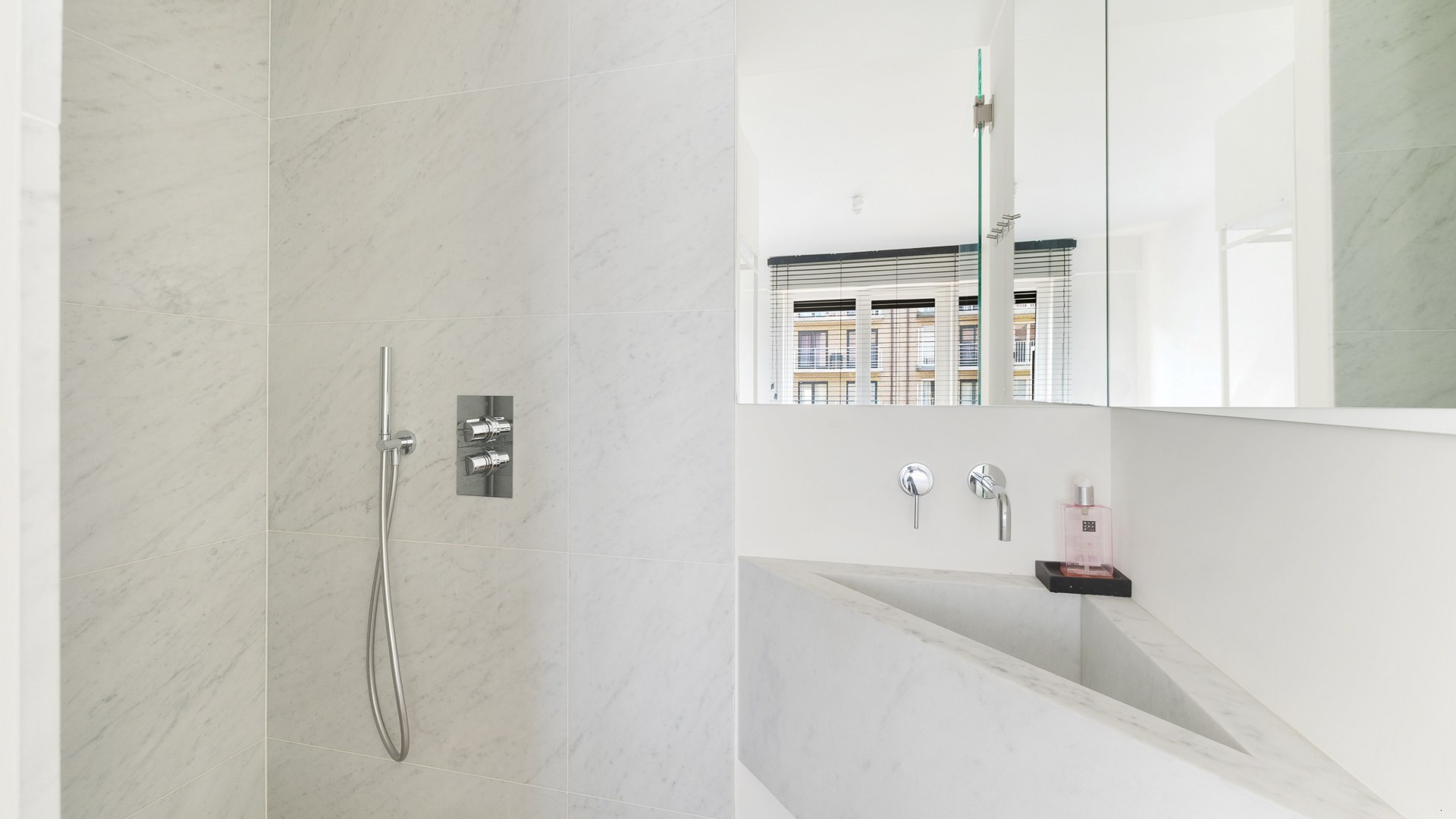 Aan de achterzijde van het appartement liggen twee ruime slaapkamers, die elk beschikken over een eigen douchekamer. Zowel voor- als achteraan is er een ruim terras, groot genoeg om comfortabel een tafeltje te plaatsen en te genieten van de buitenlucht.