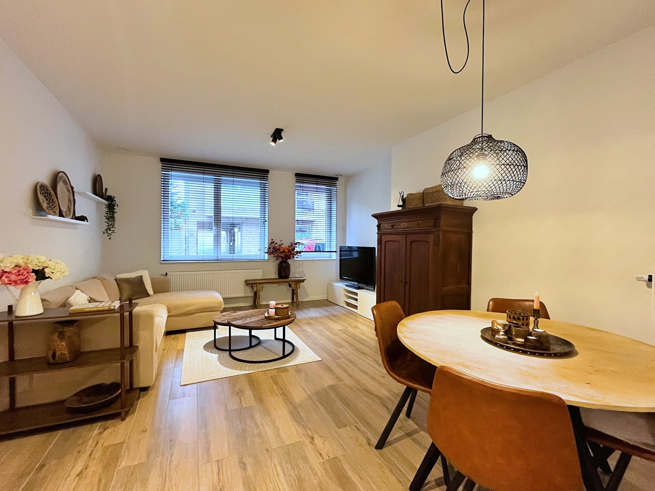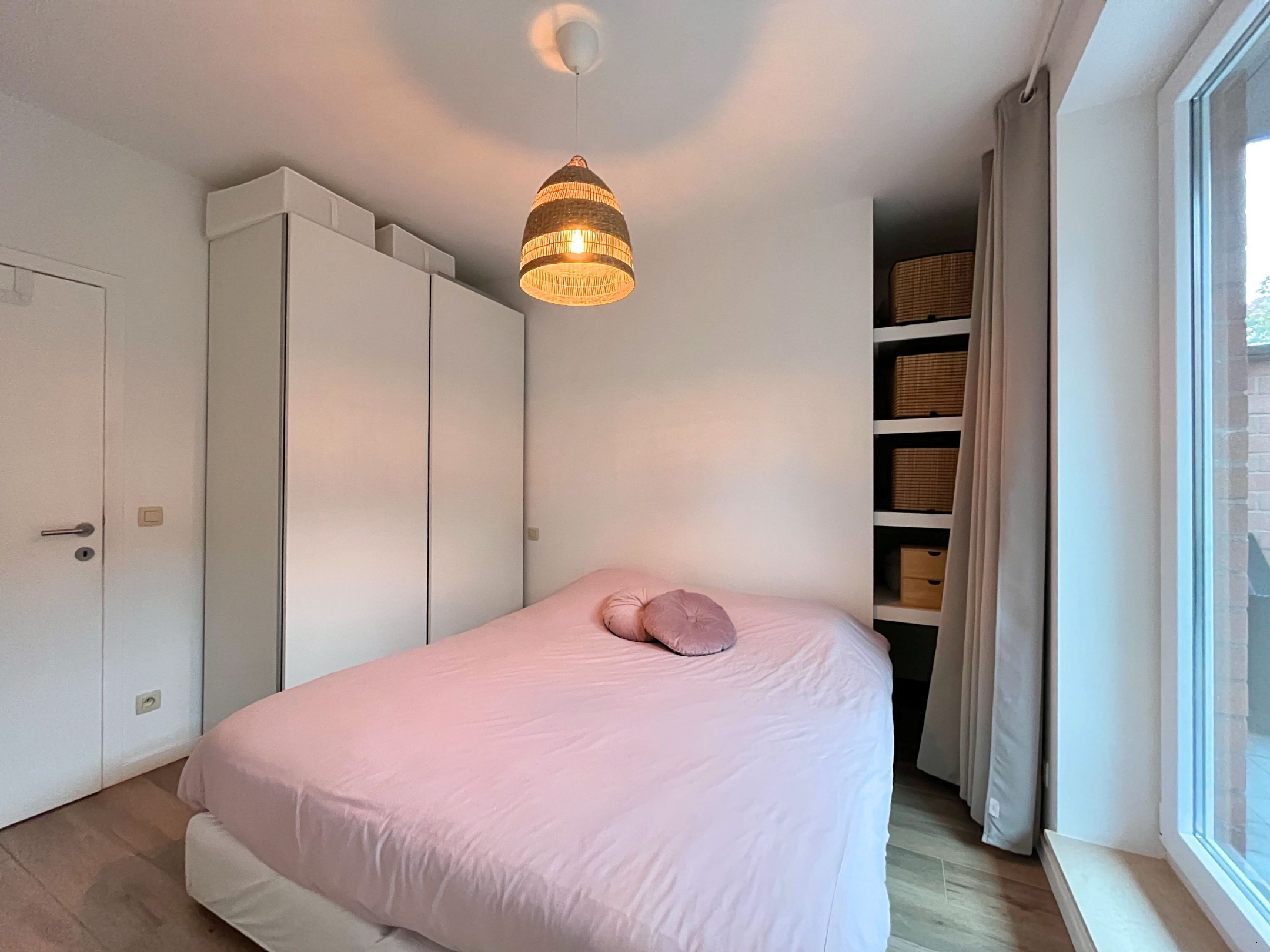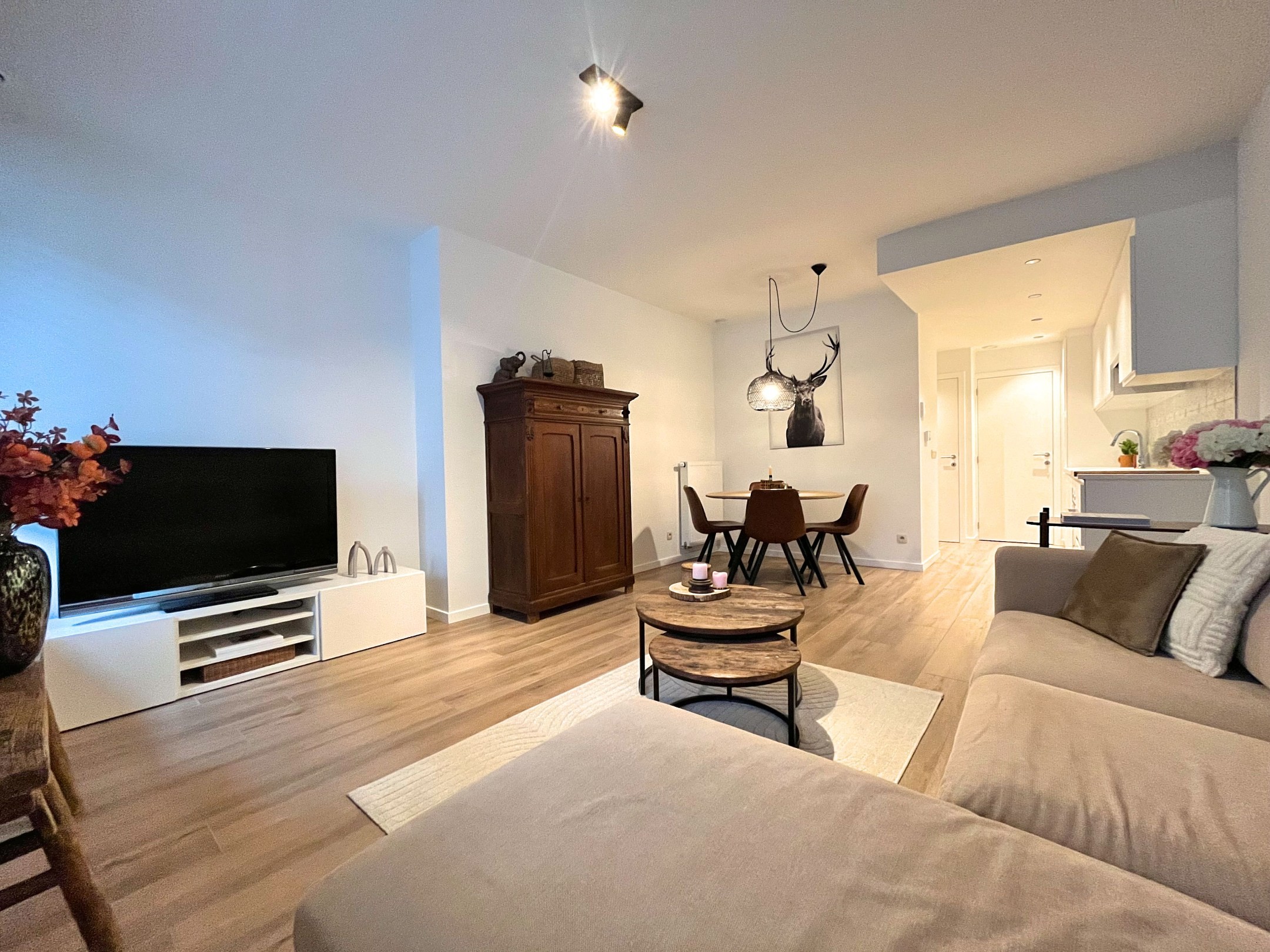 Het appartement bevindt zich op het gelijkvloers van een mooi gebouw. Ook het appartement werd smaakvol ingericht met mooie materiaalkeuzes doorheen het appartement.