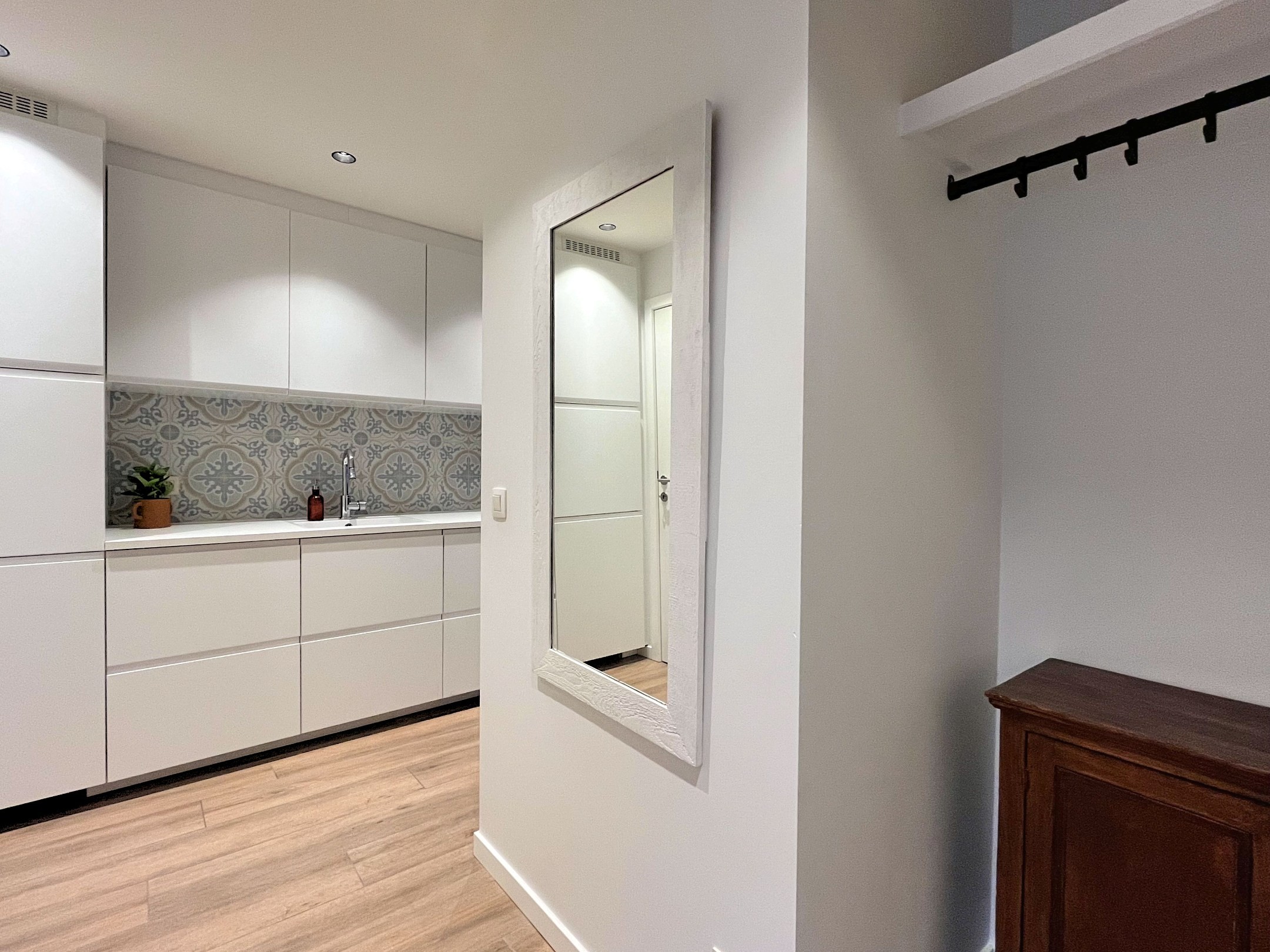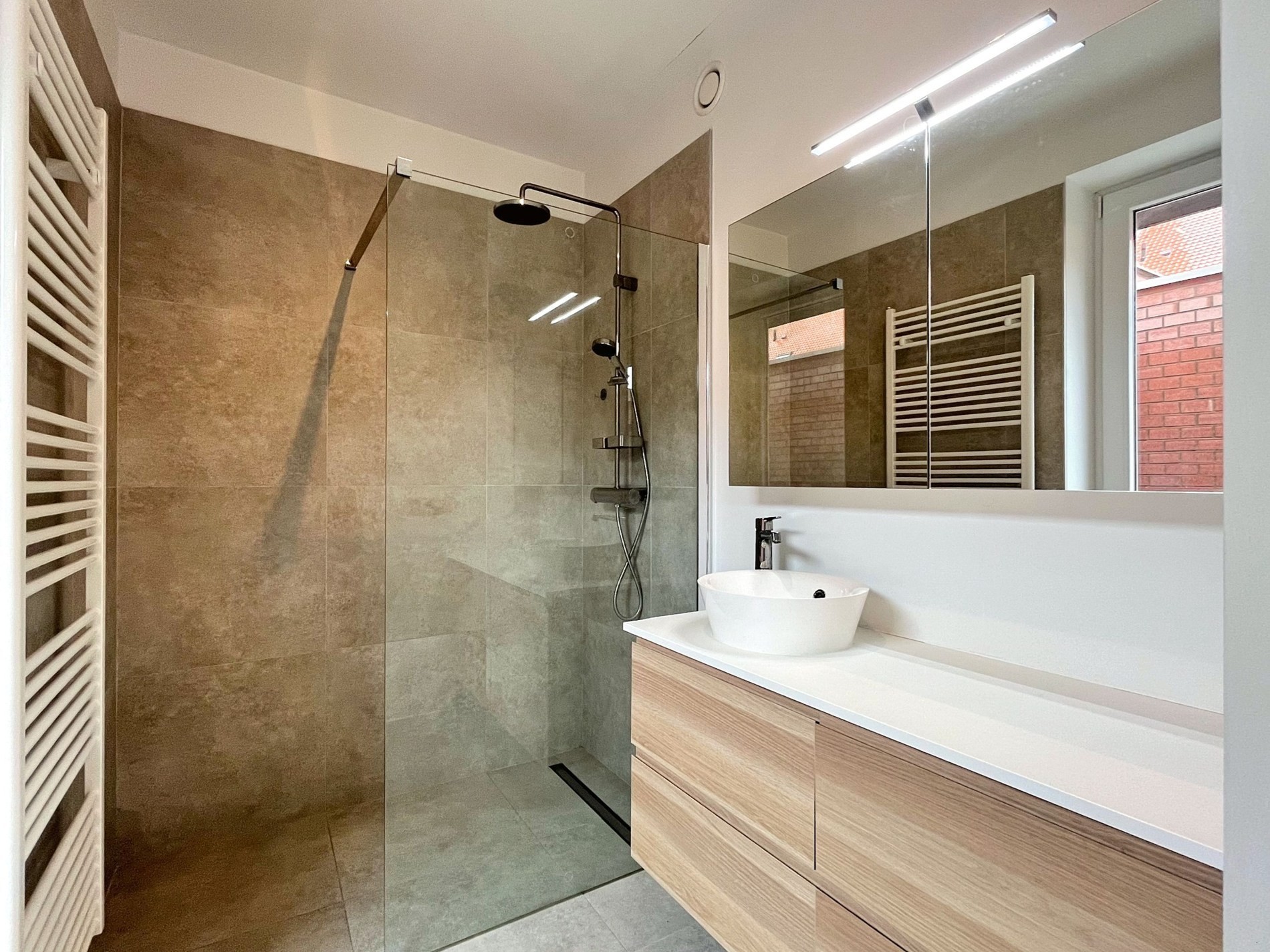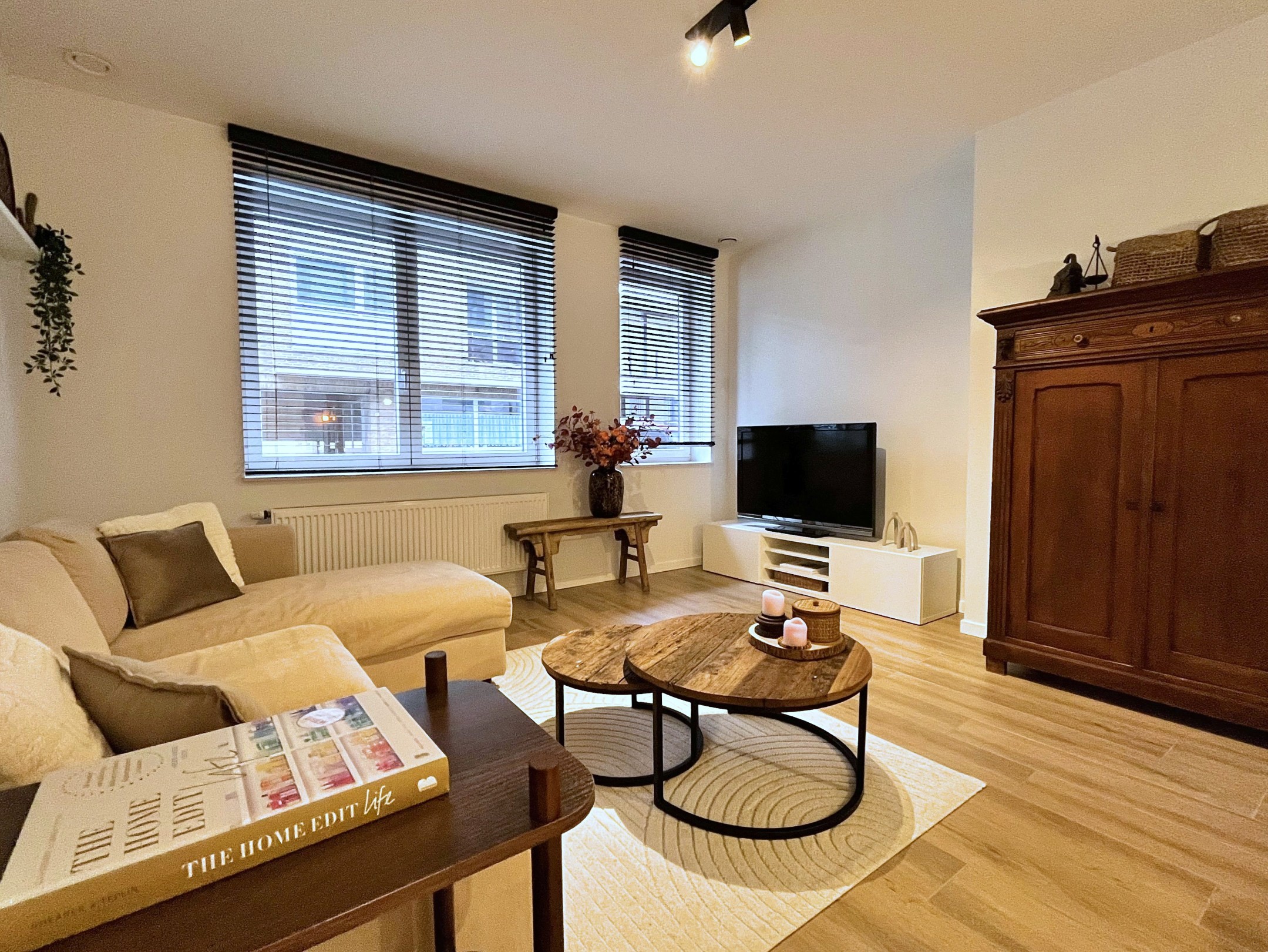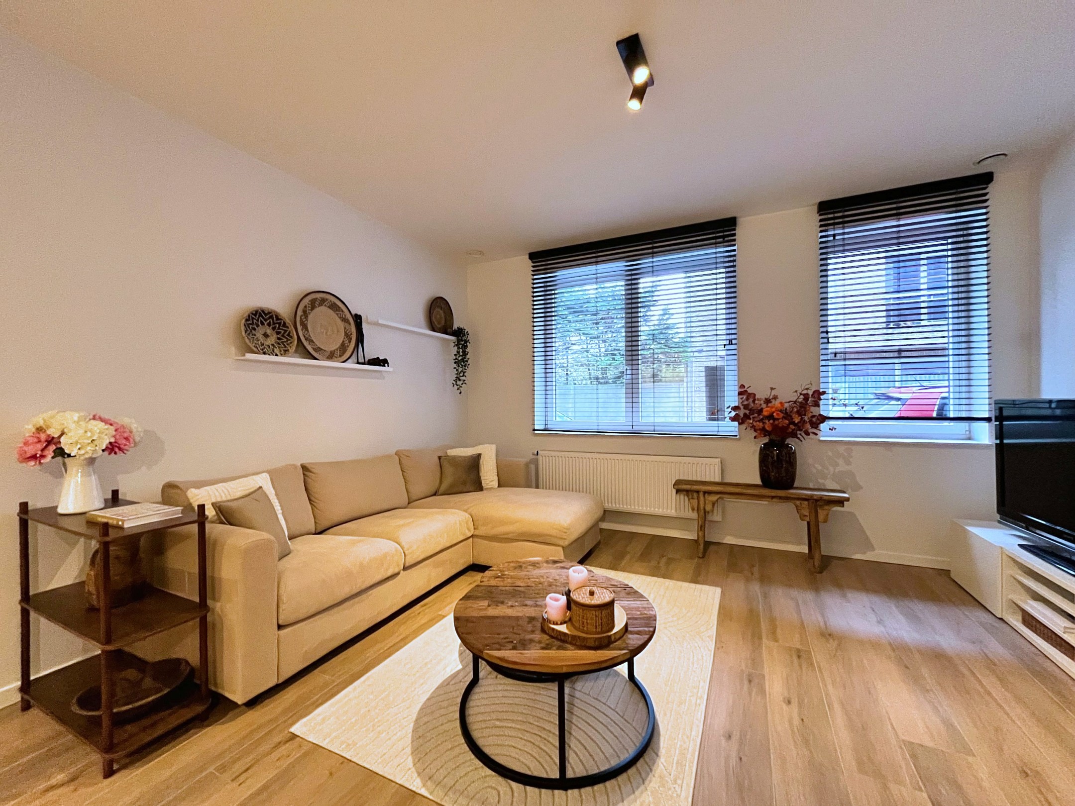 Het appartement bevindt zich op het gelijkvloers van een mooi gebouw. Ook het appartement werd smaakvol ingericht met mooie materiaalkeuzes doorheen het appartement.
