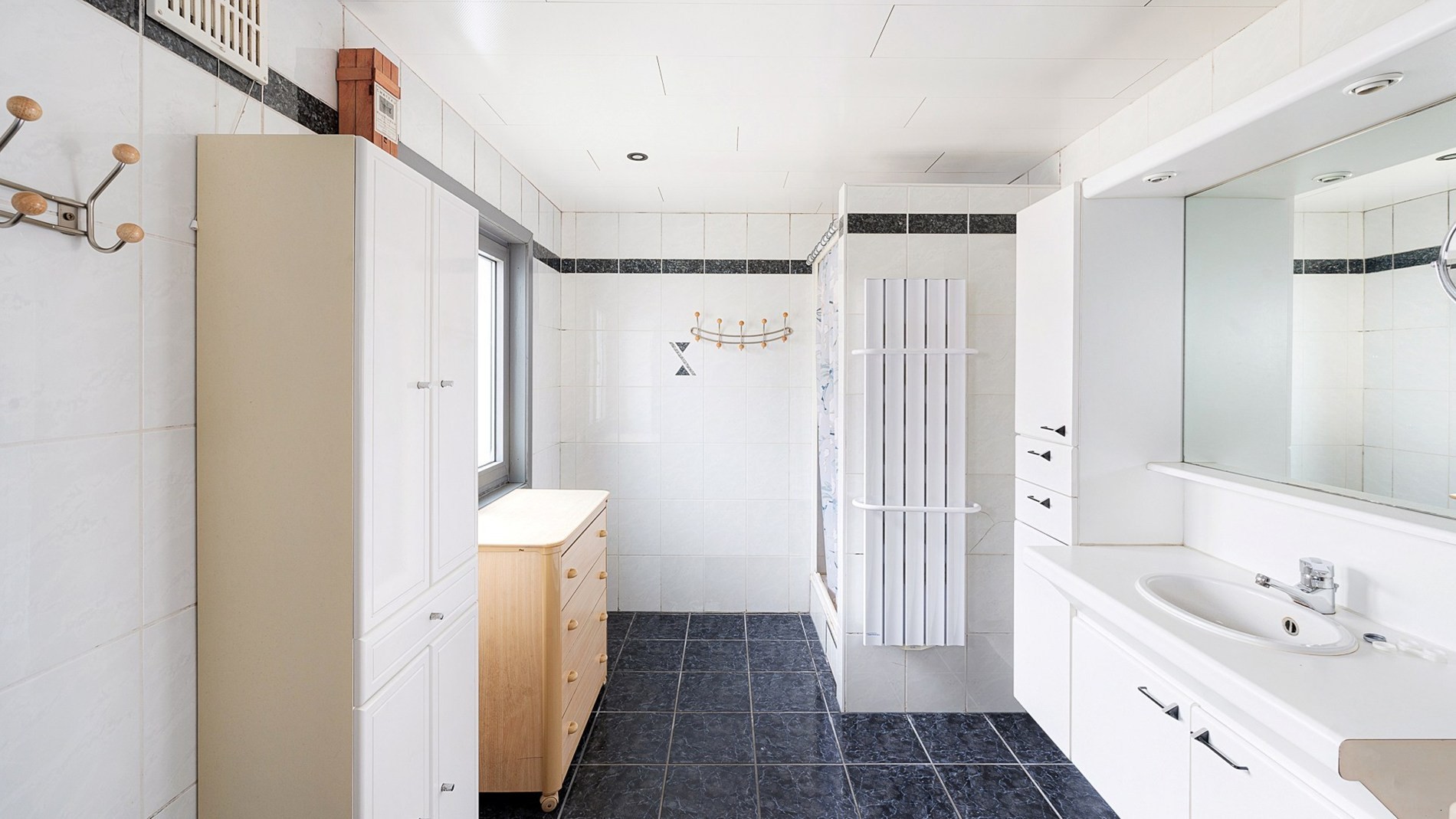 Indeling: inkomhal aan de zijkant van het huis met rechtstreekse verbinding naar de eerste garage, een aangename leefruimte met een volledig ingerichte open keuken, een veranda met toegang tot de tuin. Verder nog een ruime badkamer en 4 volwaardige slaapkamers (waarvan 1 met dressing). Grote buitenruimte met veel plaats en veel potentieel.