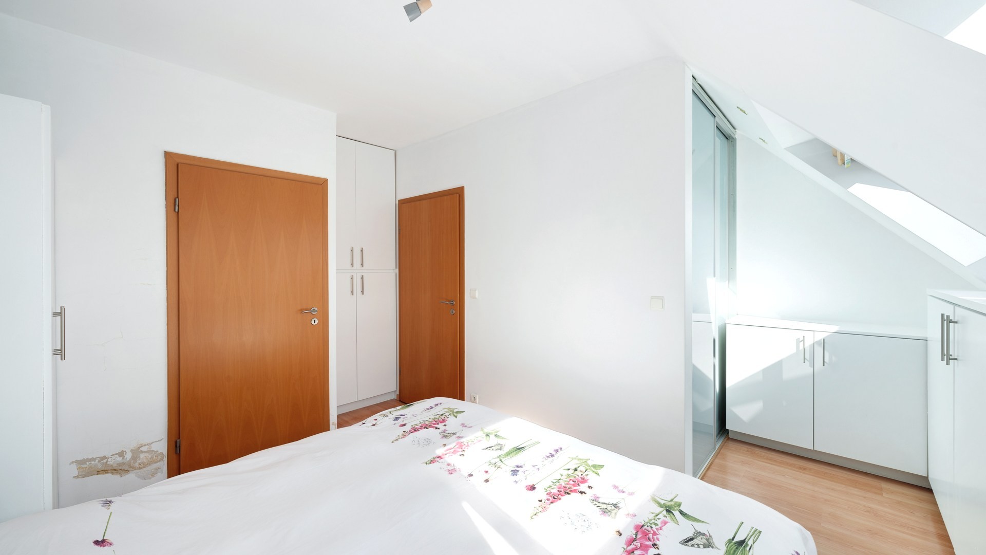 De indeling is doordacht en praktisch met op de vierde verdieping een aparte inkomhal met traphal en gastentoilet, een lichtrijke woonkamer die uitgeeft op een eerste terras aan de straatzijde, een volledig ingerichte keuken met eetplaats met eveneens directe toegang tot het tweede terras, waar u ’s namiddags kunt genieten van de zon. Op dit niveau verder ook nog een ingerichte douchekamer. Op de bovenverdieping bevinden zich twee slaapkamers en een grote badkamer met ligbad, douche en een tweede toilet.