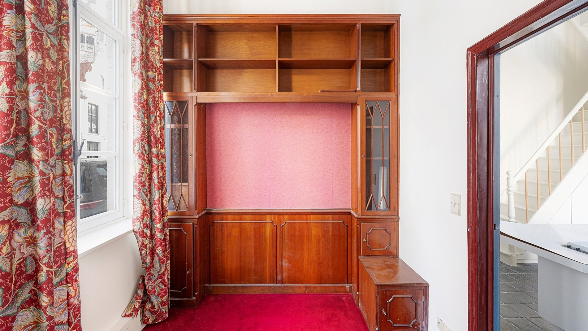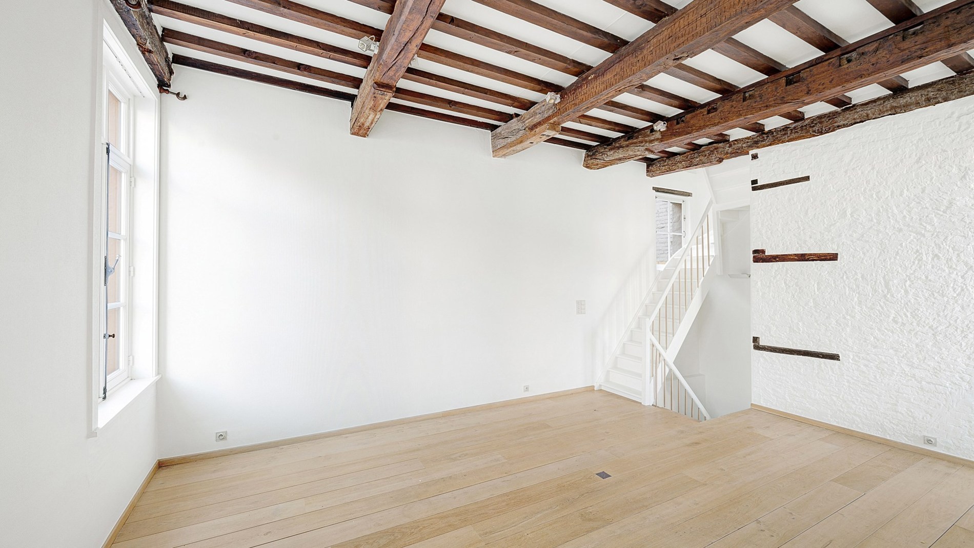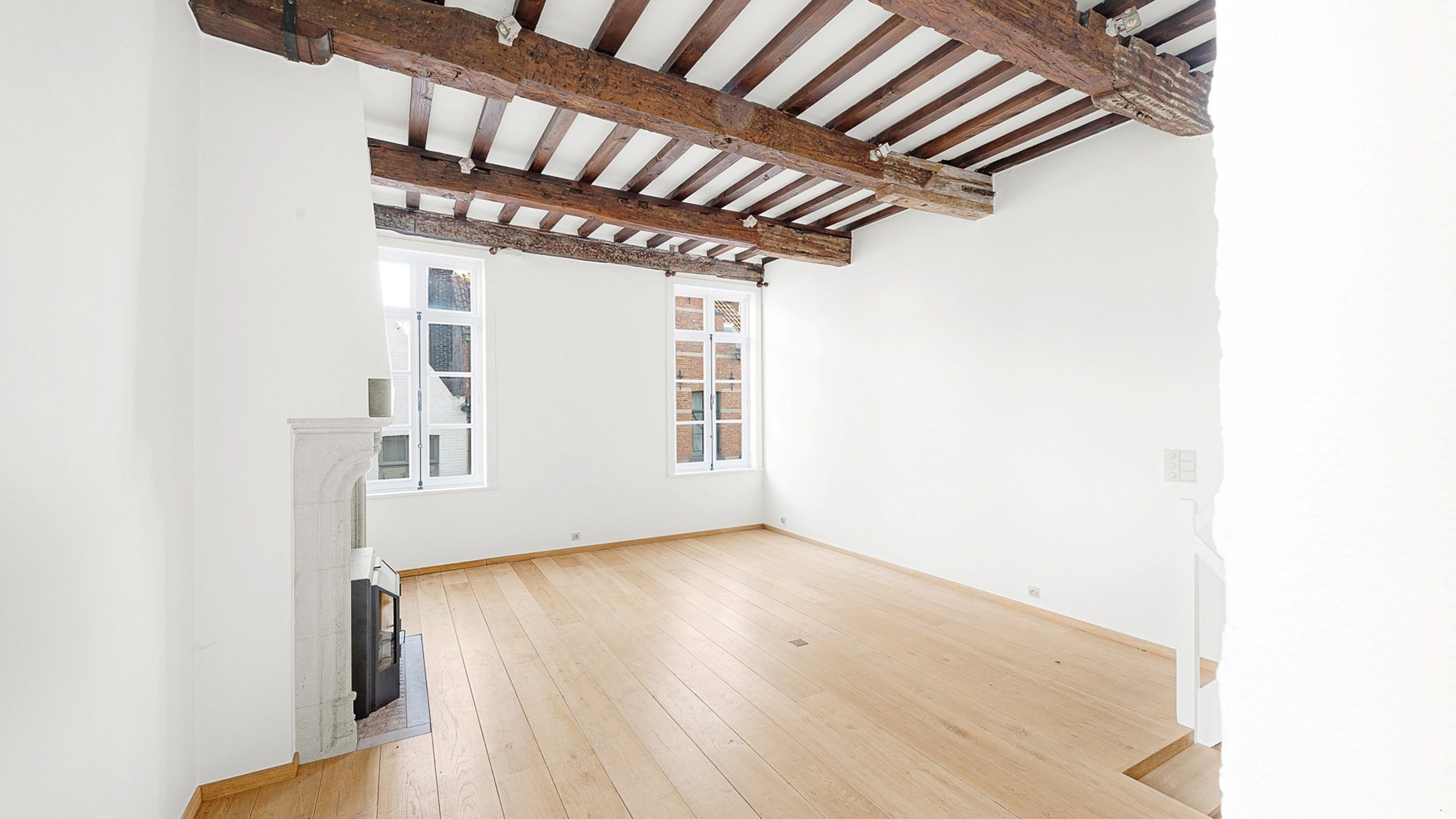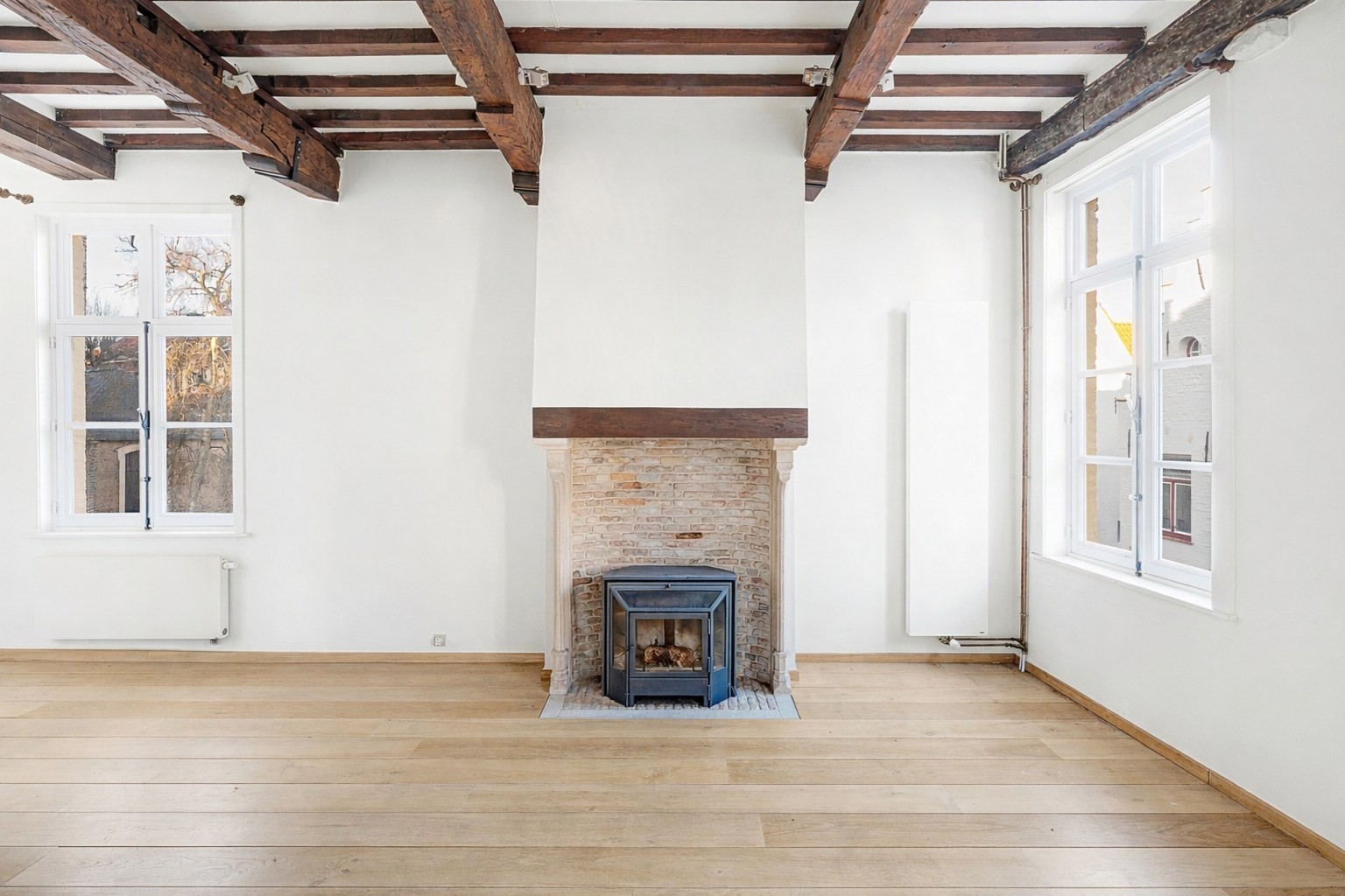 Op de eerste verdieping een ruime en lichtrijke woonkamer. Vanuit de leefruimte geniet u van een open en uniek zicht op het Sint-Annaplein, één van de meest charmante pleinen van Brugge.
