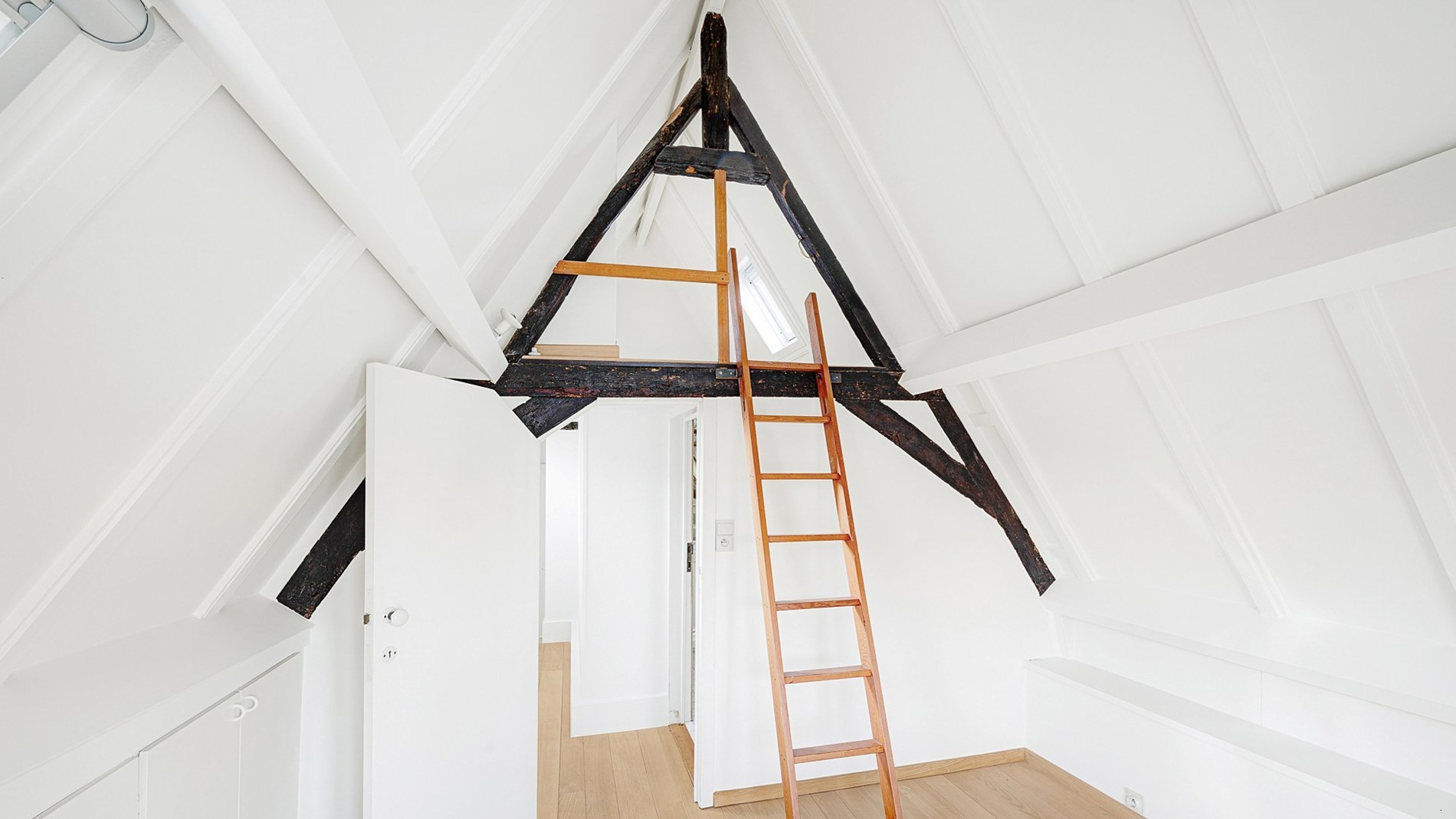 Op de tweede verdieping bevindt zich een slaapkamer met een extra mezzanineruimte. Deze kan perfect dienen als bergruimte, speelhoek of slaapplaats voor kinderen. Verder een badkamer met lavabo, toilet en bad.