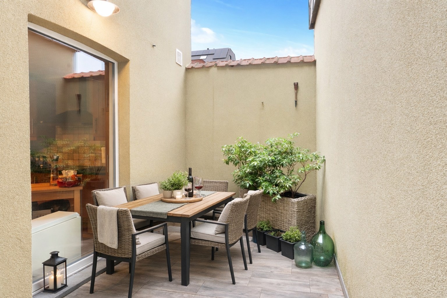 Op het gelijkvloers een gezellige leefruimte met hoge plafonds en een prachtige parketvloer. De keuken is halfopen en goed uitgerust. De keuken en de leefruimte kijken uit op een klein maar gezellig stadsterras waar u kunt genieten van een aperitief of etentje. Op de eerste verdieping zijn er twee grote slaapkamers en een ingerichte badkamer met ligbad, douche en toilet. Op de nachthal tevens nog een tweede toilet. Er is een vaste trap naar de tweede verdieping die ingerichte is met slaapkamer drie en vier. De droge kelder en de geïsoleerde zolder zorgen voor voldoende bergruimte.