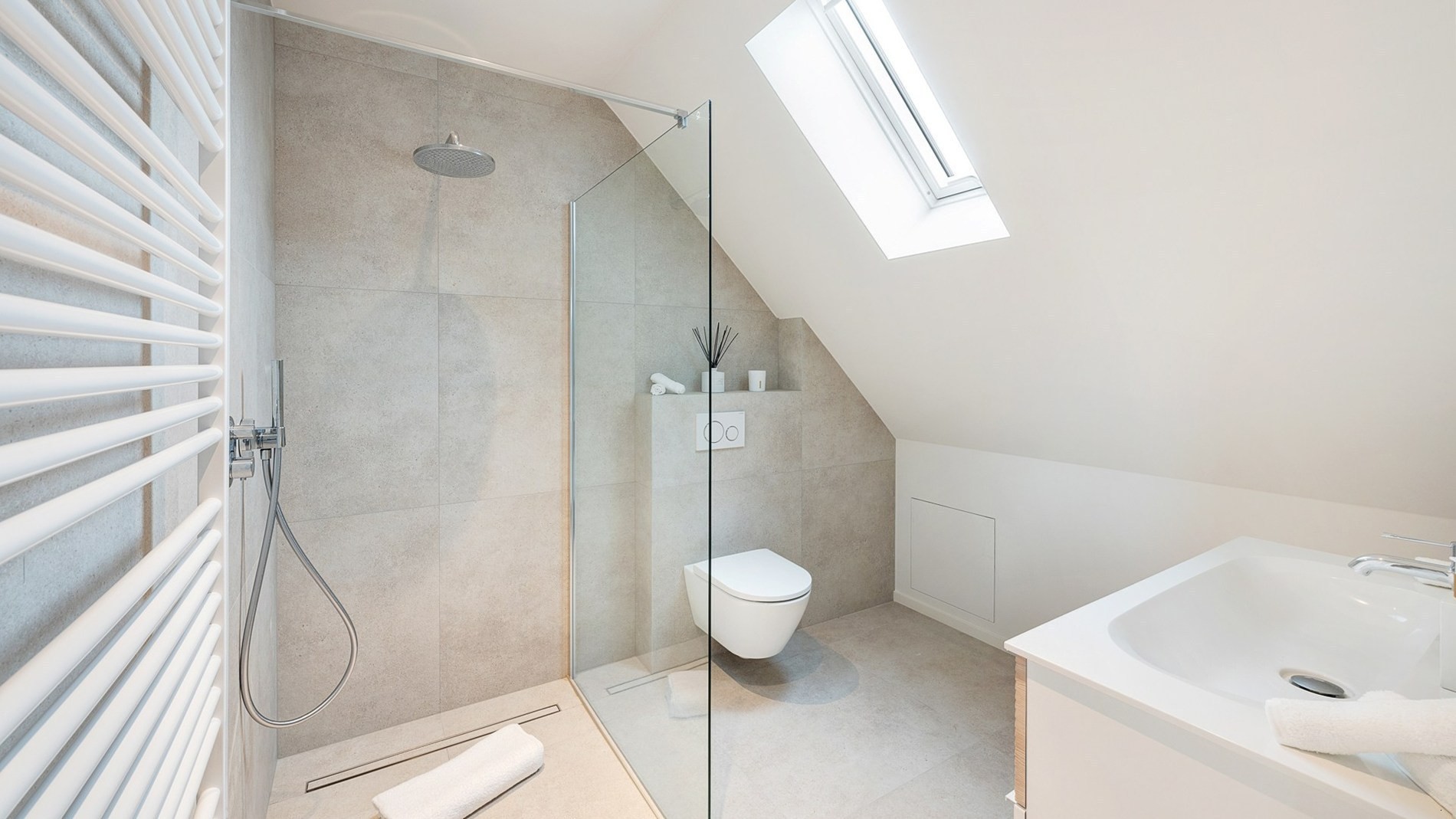 Indeling: Grote inkomhal met aparte fietsenberging, gastentoilet, een schitterende leefruimte gericht naar de zon en de tuin, een open en volledig ingerichte keuken voorzien van alle toestellen en een zuidgerichte tuin met zonneterras. Op de eerste verdieping zijn er twee grote slaapkamers en een compleet ingerichte badkamer met inloopdouche, ligbad, dubbele lavabo en toilet. De vaste trap brengt ons tot de bovenste verdieping met een extra ruime derde slaapkamer voorzien van zijn eigen badkamer met inloopdouche.