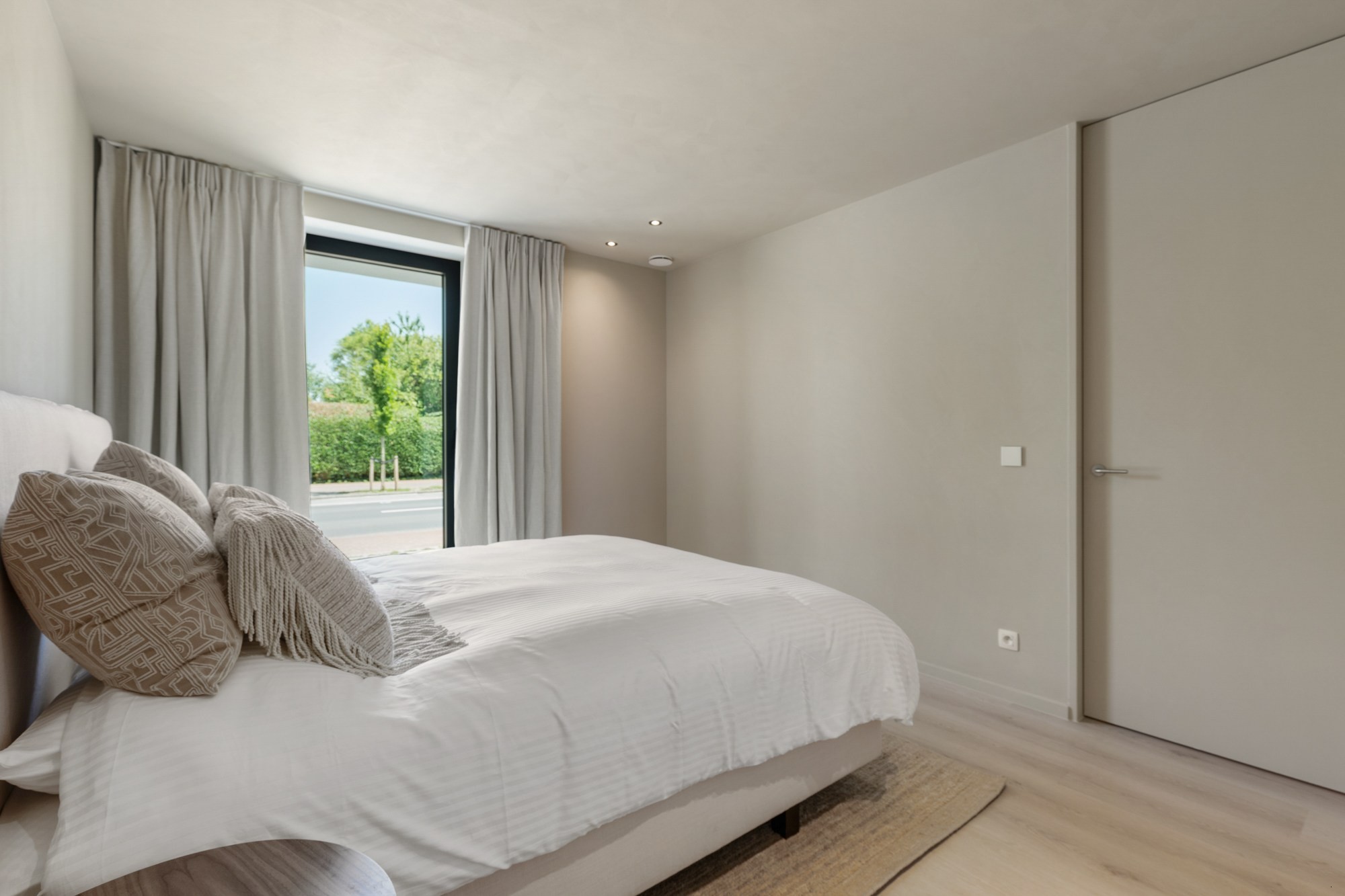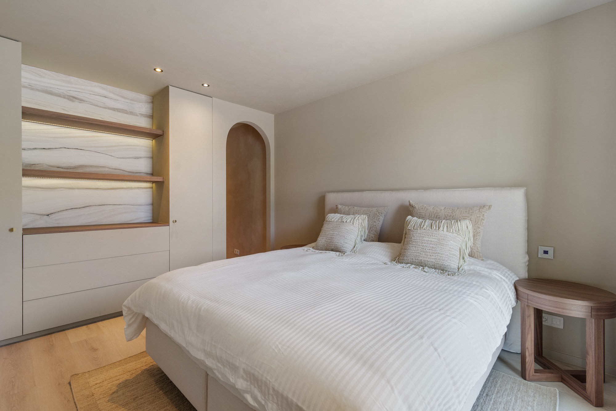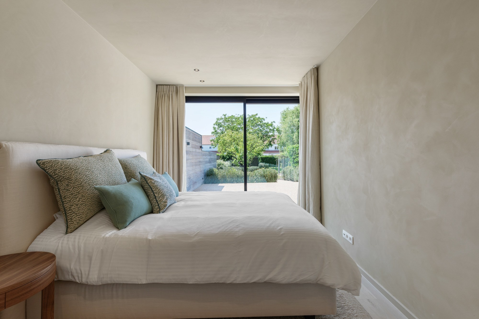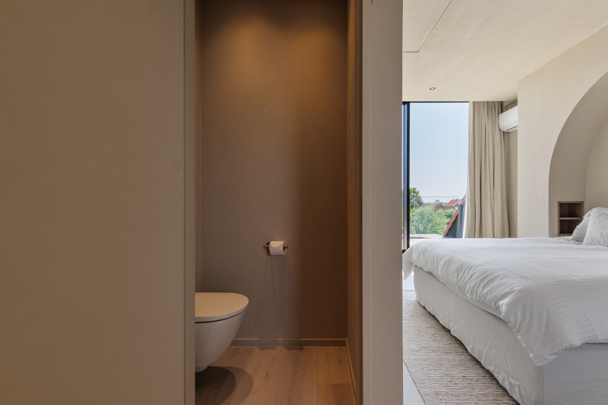 De gelijkvloerse verdieping telt 3 grote slaapkamers, elk met een eigen douchekamer, ingebouwde maatkasten en veel comfort. De vierde slaapkamer bevindt zich op de dakverdieping en is ingericht als een echte master bedroom met privébadkamer, dressing en apart toilet.