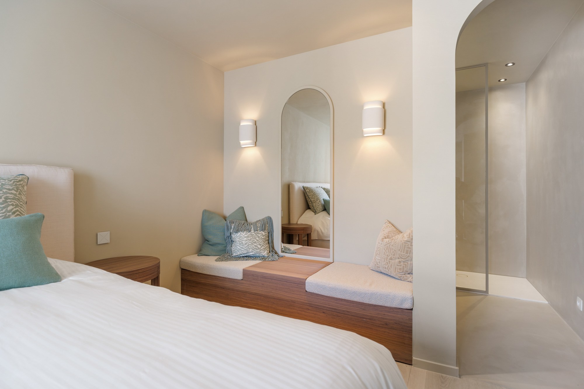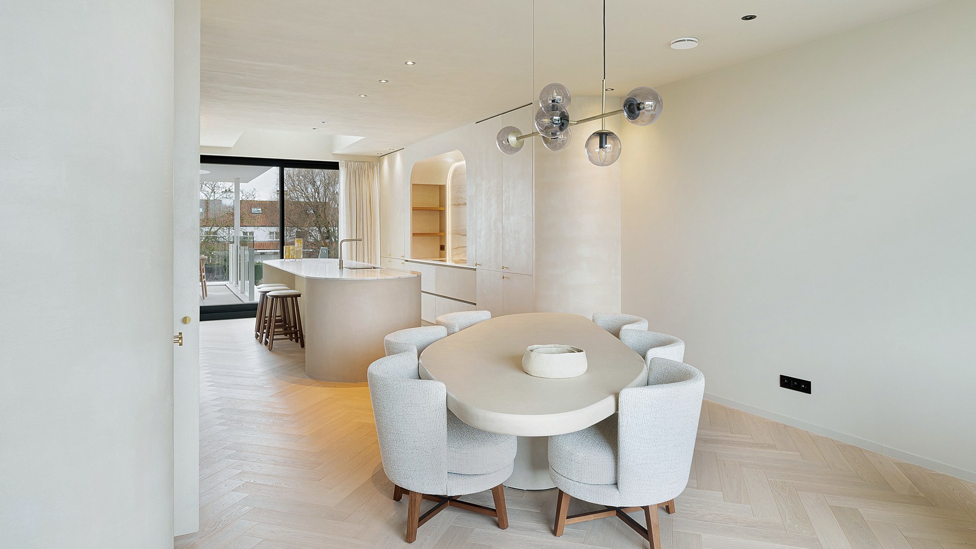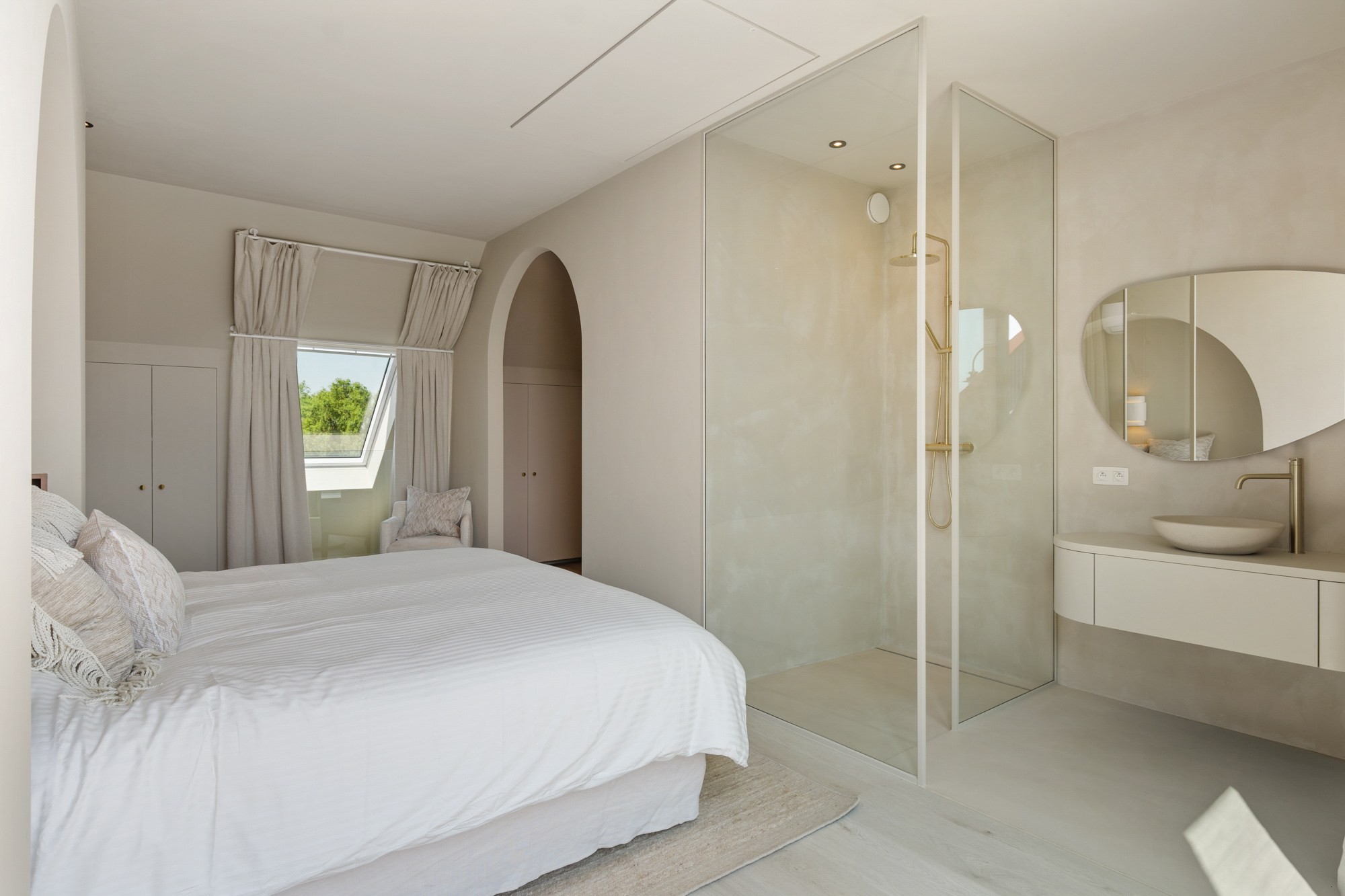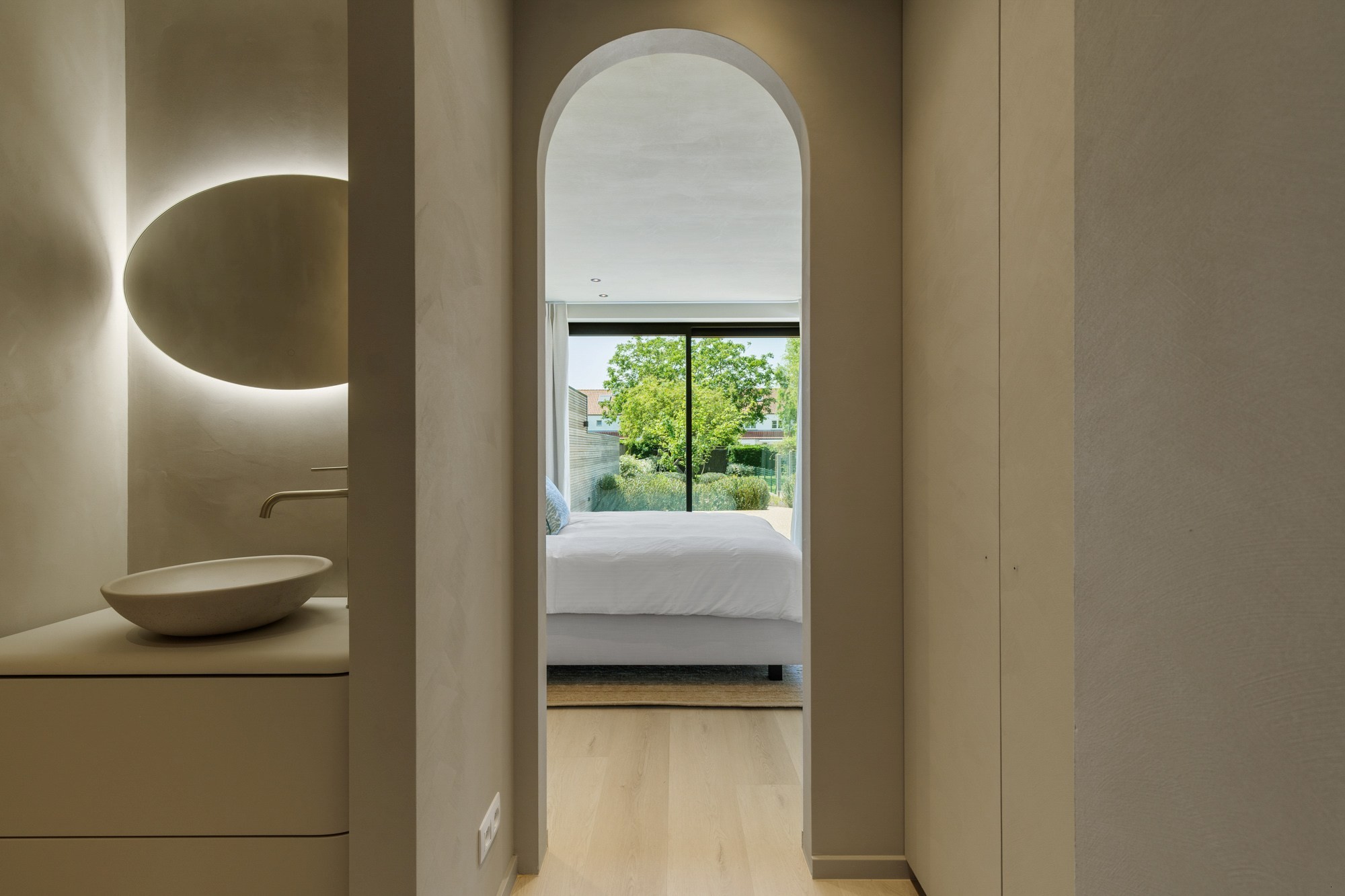 De gelijkvloerse verdieping telt 3 grote slaapkamers, elk met een eigen douchekamer, ingebouwde maatkasten en veel comfort. De vierde slaapkamer bevindt zich op de dakverdieping en is ingericht als een echte master bedroom met privébadkamer, dressing en apart toilet.