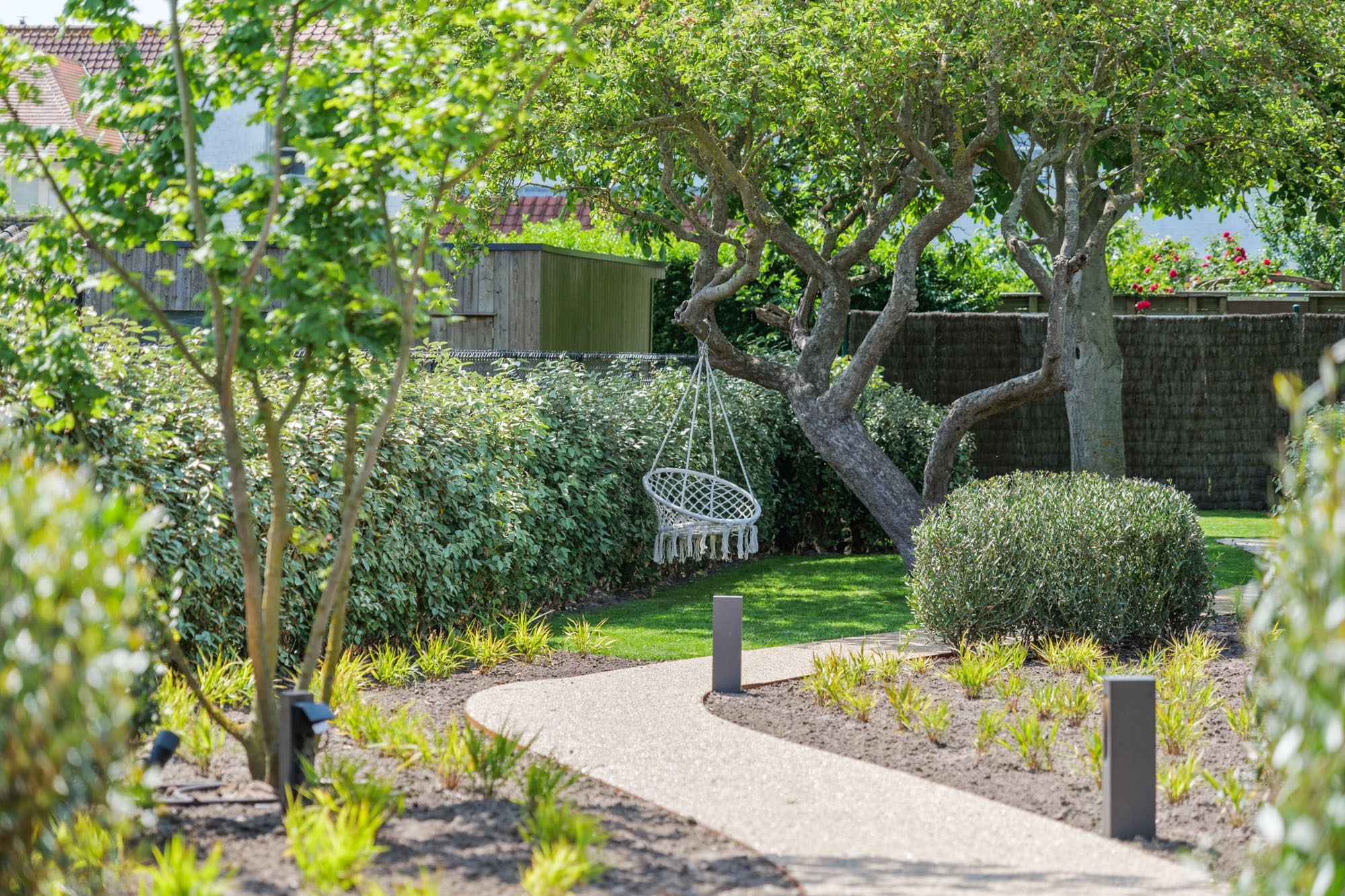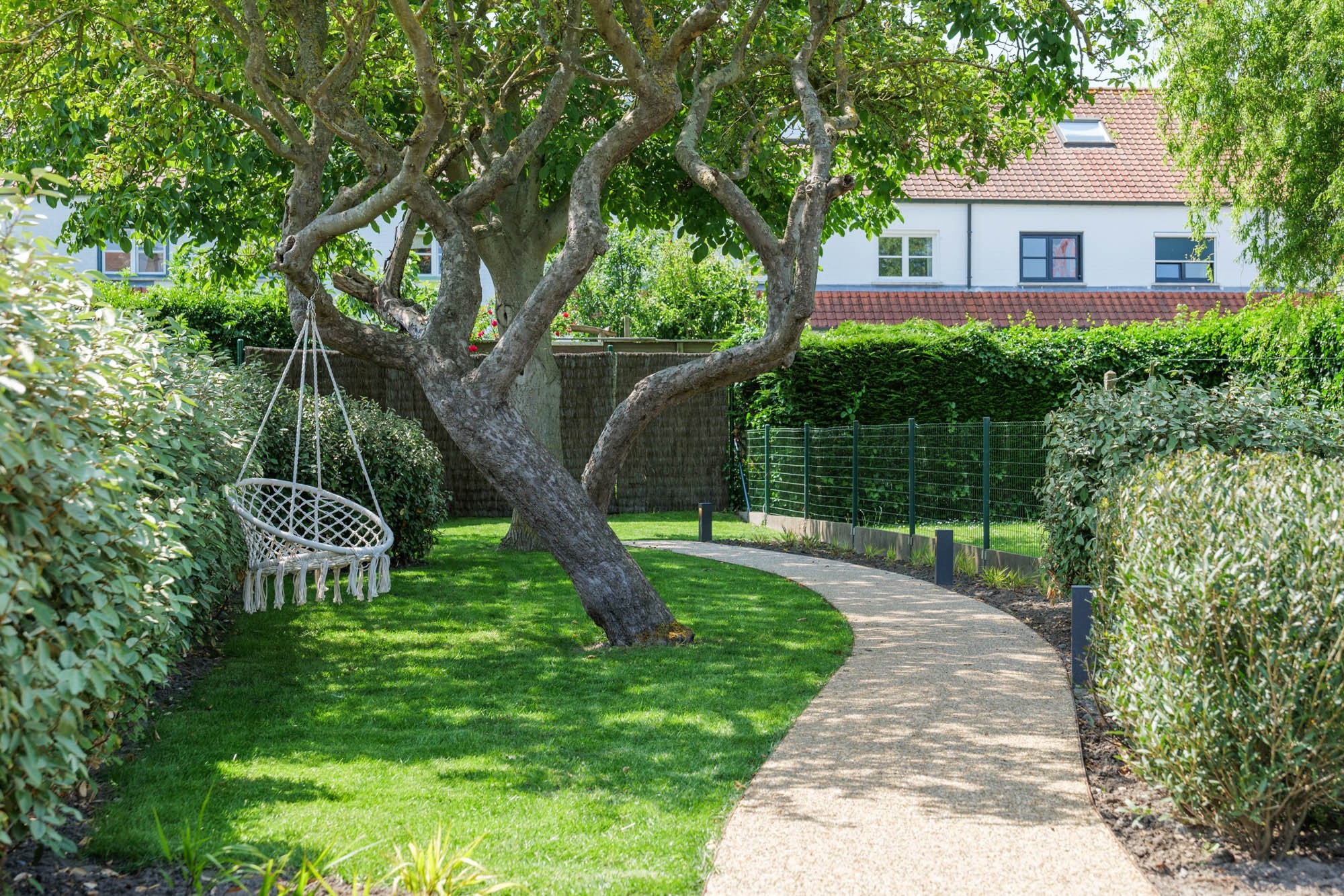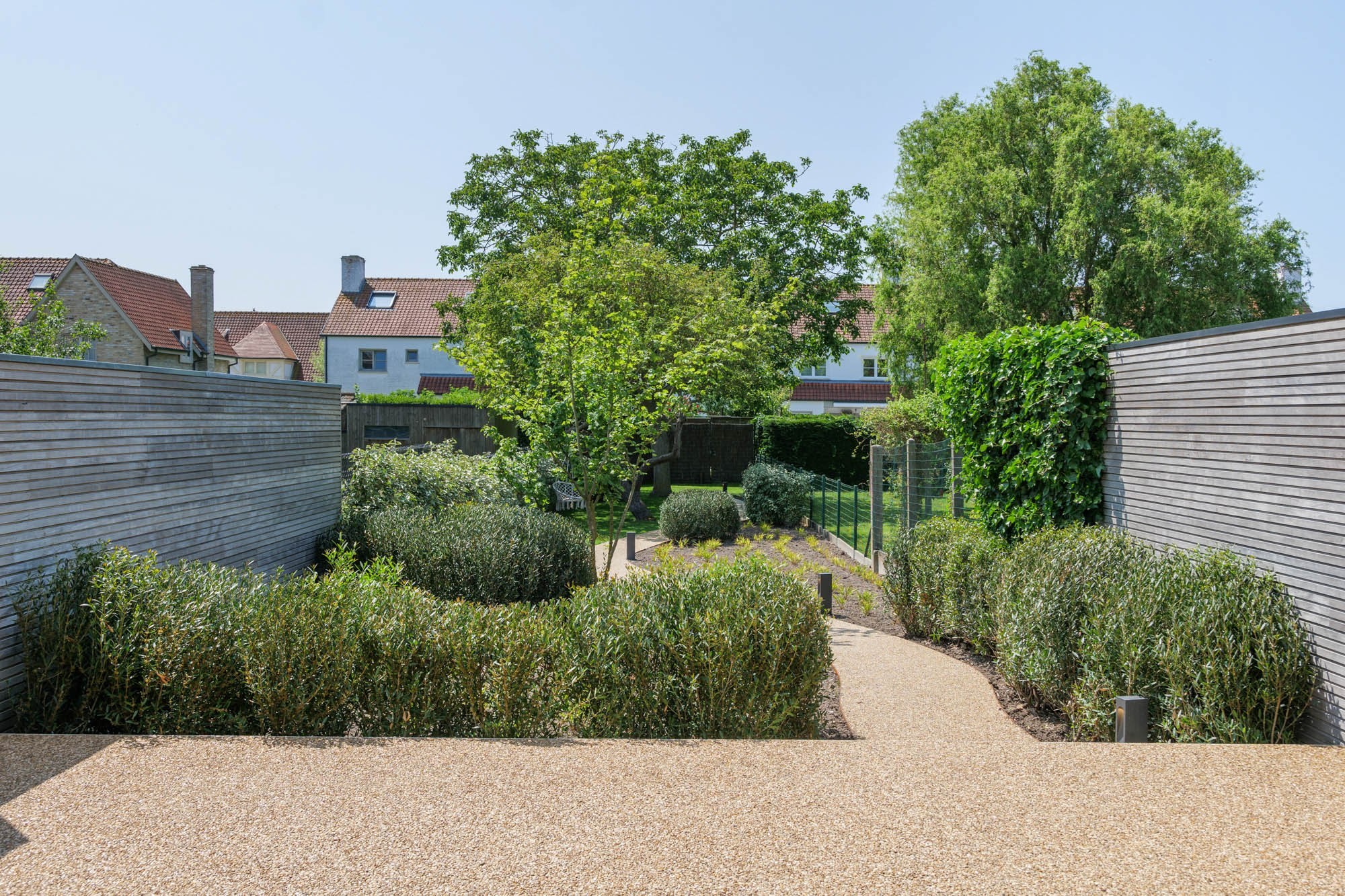 De tuin is prachtig aangelegd en perfect onderhouden, met een zonnig terras, een automatisch sproeisysteem en achteraan toegang tot een garagecomplex. Indien gewenst kan hier een garage worden bijgehuurd. Vooraan de woning is bovendien een private parkeerplaats voorzien.