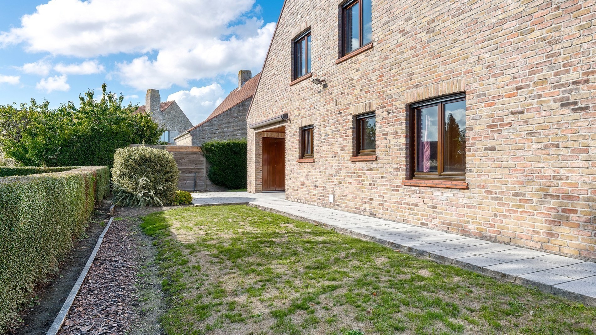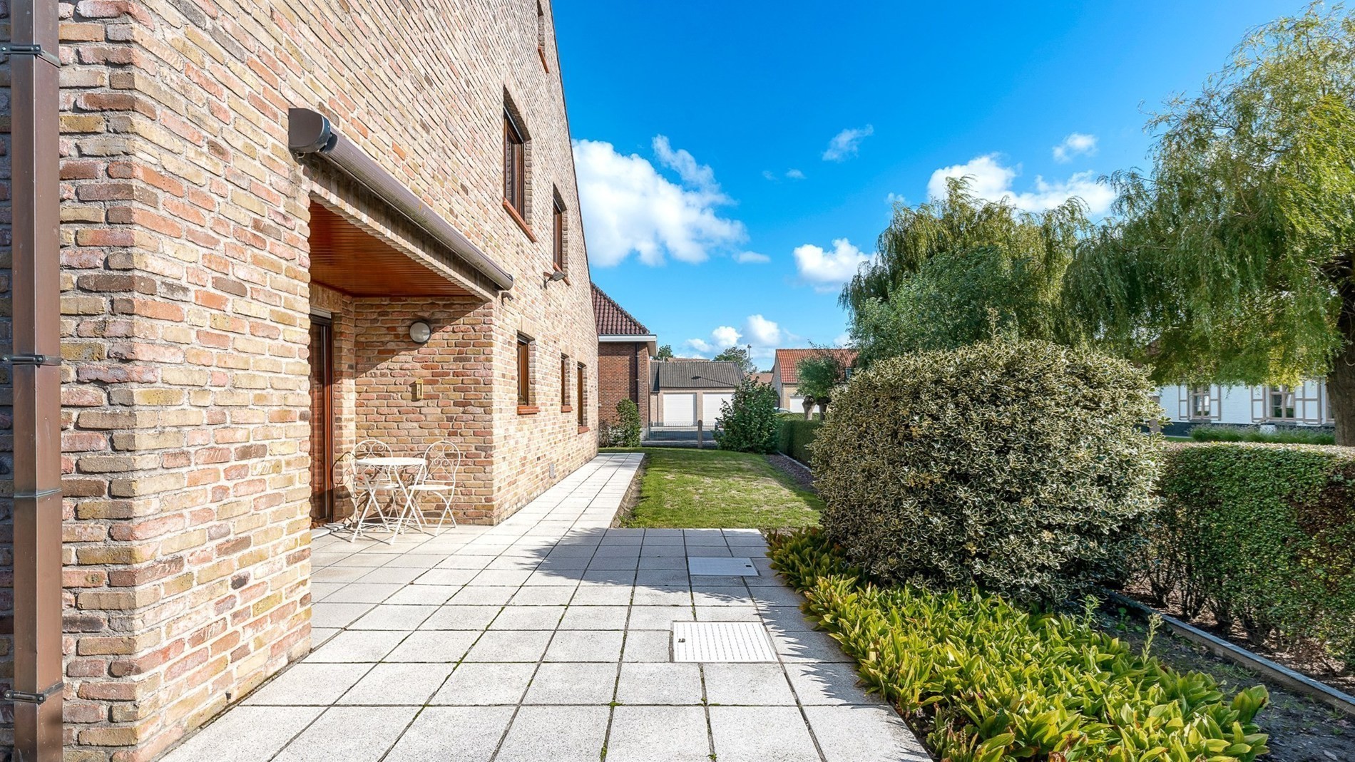 Rondom het huis een verzorgde tuin met enkele terrassen en een grote oprit met parkeerplaatsen voor het huis. Parkeren kan ook binnen in de garage.