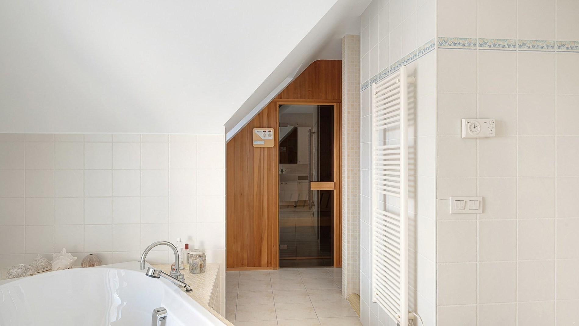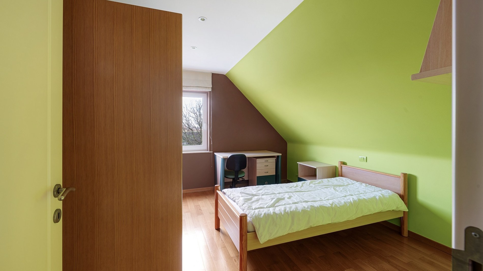 De villa beschikt over een uitzonderlijk woonvolume (312 m²) en werd als volgt ingedeeld: een grote inkomhal en een gastentoilet, een aparte bureau of logeerkamer, een schitterende woonkamer opgedeeld in een zit- en eetplaats en een volledig uitgeruste leefkeuken met rechtstreekse toegang naar de tuin. Naast de keuken nog een praktische bijkeuken/wasplaats en toegang naar een grote inpandige garage. Boven zijn er 3 volwaardige slaapkamers (waarvan 1 met zijn eigen walk-in dressing), een apart toilet en een royale badkamer met douche, bad en sauna. Ruime opbergzolder op de derde bouwlaag.