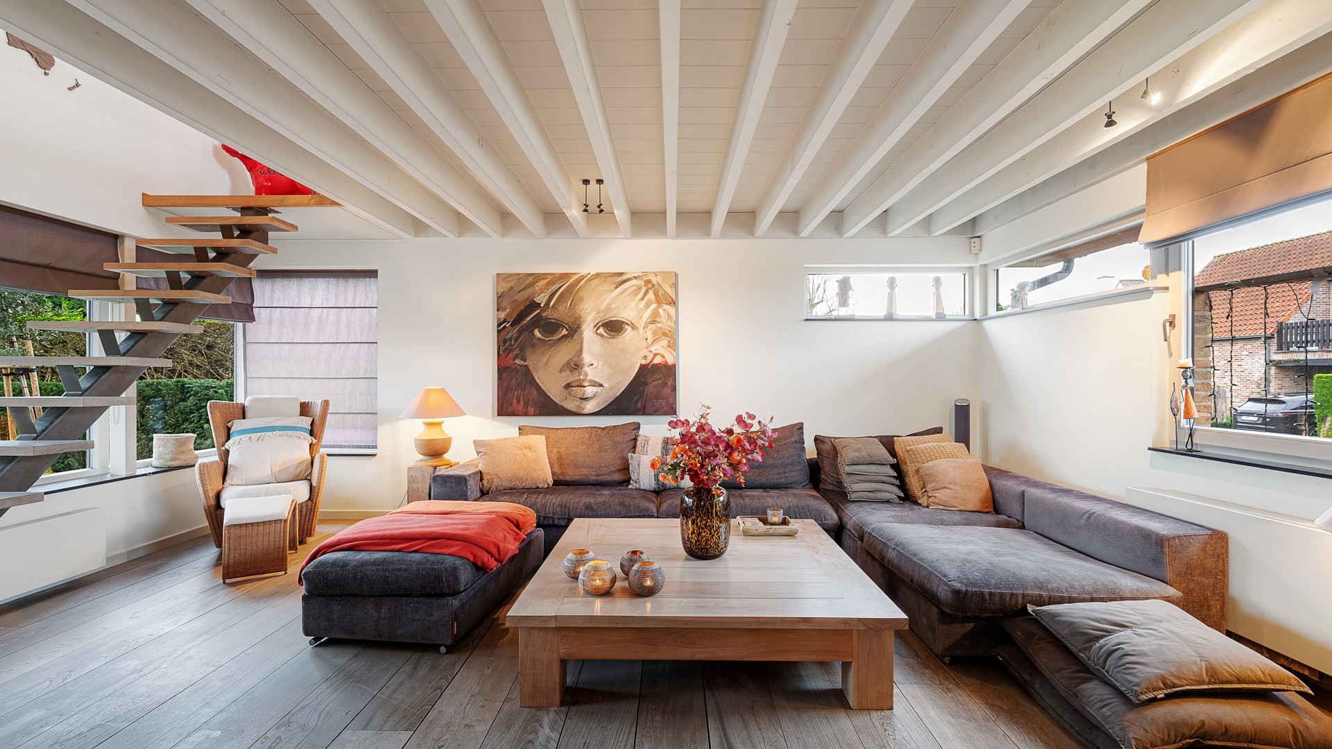 De woning werd gebouwd in 1997. Via de inkomhal met vestiaireruimte en gastentoilet komt men in de zongerichte leefruimte, afgewerkt met parketvloeren en een echte open haard. De leefruimte is ingedeeld met een eethoek, een open en volledig ingerichte keuken en een gezellige zithoek. Aansluitend bevindt zich een uitbouw, perfect in te richten als extra eetplaats of bureauruimte. Verder beschikt het gelijkvloers over een bijkeuken, een ruime garage en een droge kelder.