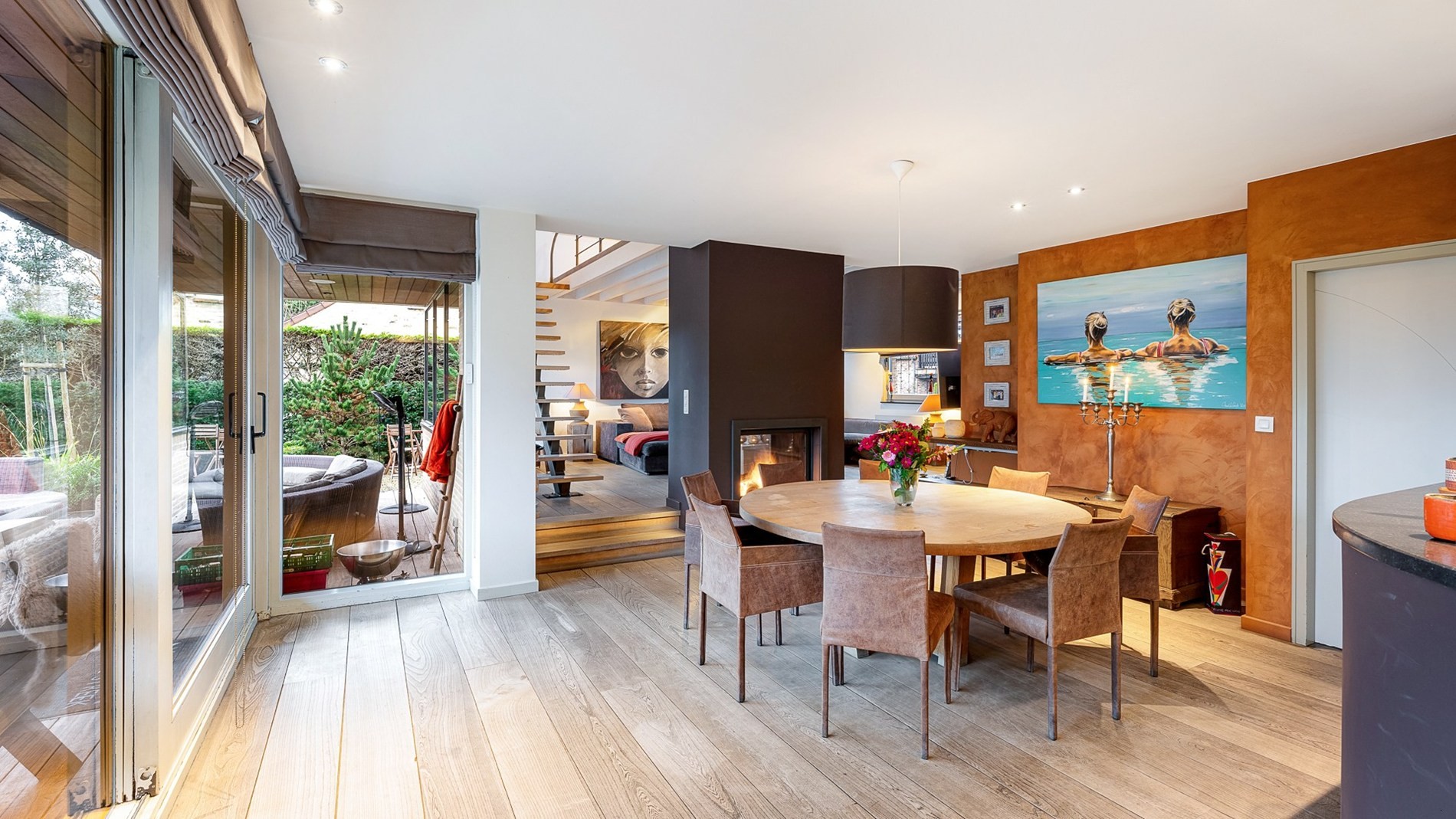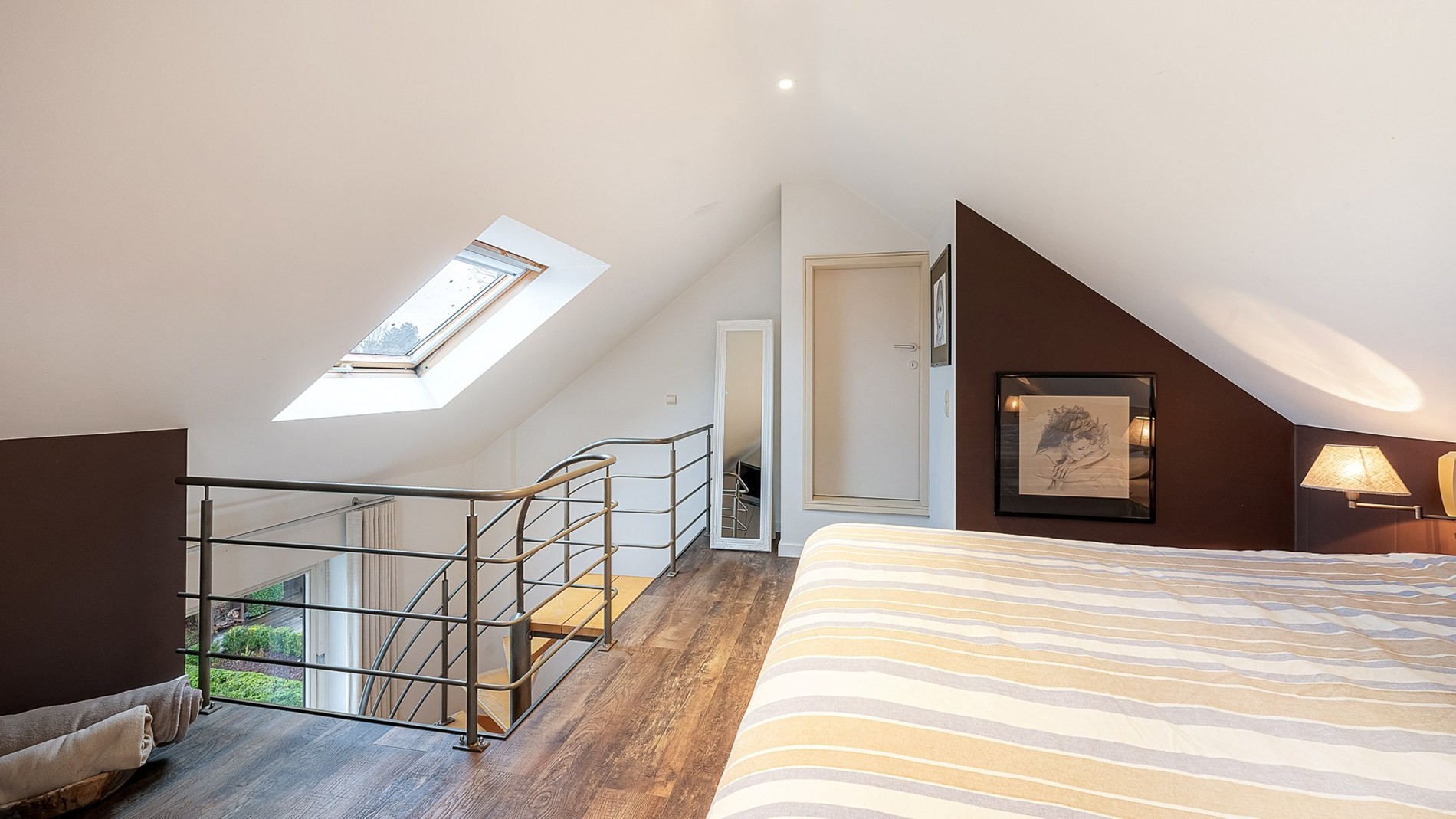 Indeling: Inkom met gastentoilet, een grote leefruimte met een gezellige zitplaats (open haard) en een eetplaats met zicht op de tuin. De keuken is open en volledig ingericht. Naast de keuken nog een bureauruimte of bijkomende eetplaats. Verder op het gelijkvloers een praktische bijkeuken en wasplaats en een extra grote garage. Op de verdieping: drie slaapkamers en twee badkamers. De dakverdieping is volwaardig en beschikt over een bijkomende slaapkamer en zolderruimte.